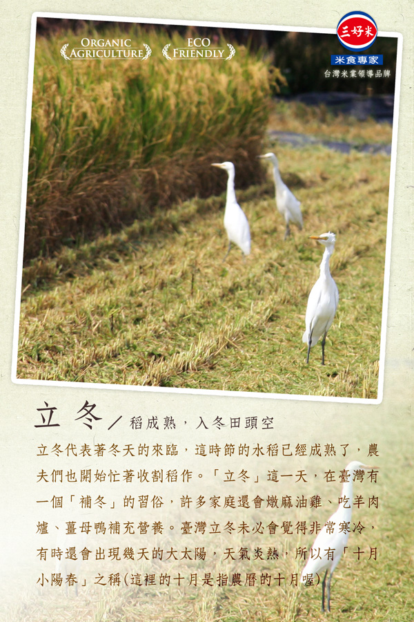 立冬代表著冬天的來臨,這時節的水稻已經成熟了,農夫們也開始忙著收割稻作。